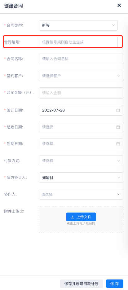 创建合同时,先选择「合同类型」,提交保存合同后会根据规则自动生成合同编号。也可以手动填写,手动填写之后,则以手动填写的编号为准。