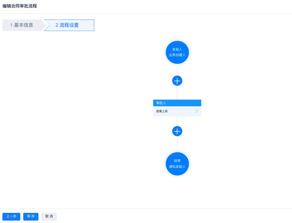 点击「编辑」,弹出合同或回款流程编辑弹窗,默认的流程为直属上级审批。