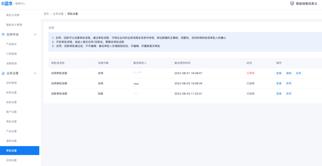 在「管理中心-业务设置-审批设置」,系统默认有合同审批流程、回款审批流程,状态为:已停用(未开启)。