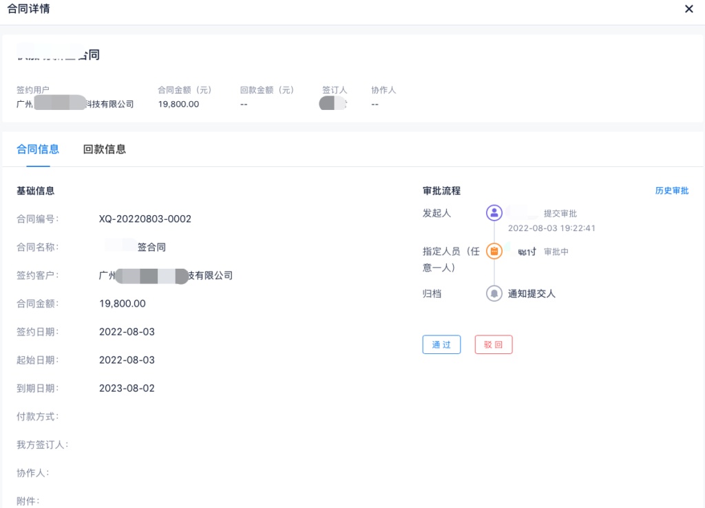 在合同详情页,审批人可以查看合同基本信息、附件,进行审批操作:通过、驳回。