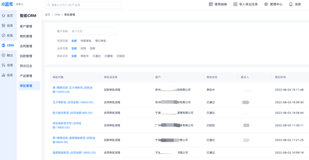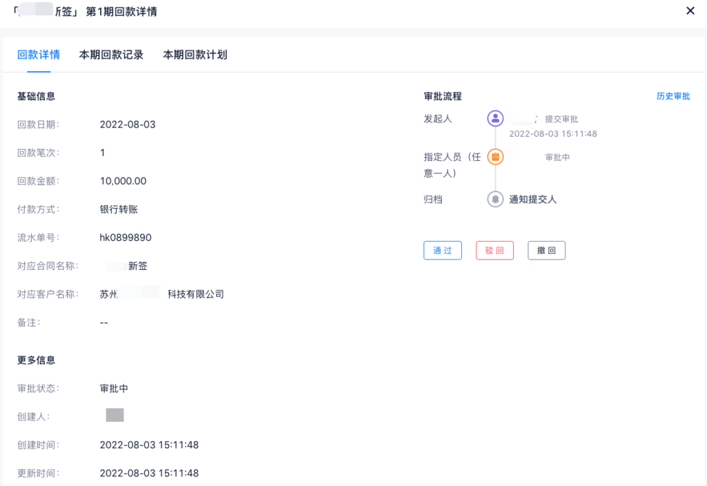 审批流程开启后,创建合同和回款记录,需要相关人员审批,审批期间,不能修改。只有驳回或提交人撤回后才可修改。