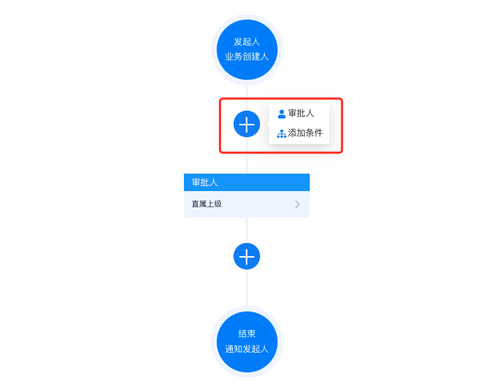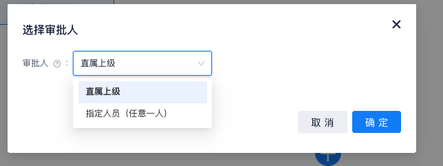 可选择:直属上级、指定人员(任意一人);直属上级,指创建人(提交人)本级部门负责人,可在「部门与员工设置」;指定人员,可添加多人,只要其中一人审核通过即可。