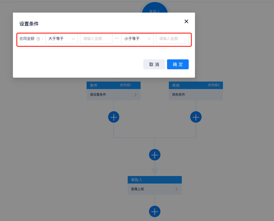 如想要大于等于x金额以上需要审批、小于x金额则不需要审批,可按如下设置: