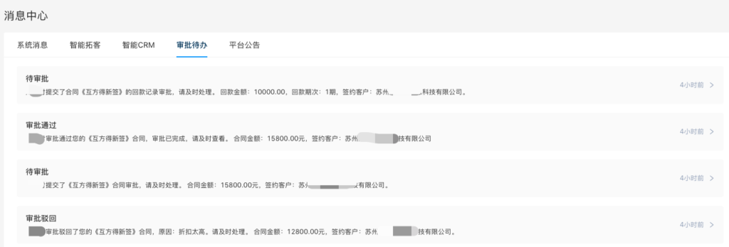 智能CRM-审批管理,可查看待我审批、我已审批的合同或回款记录。点击,可查看详情并审批。