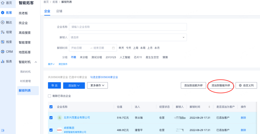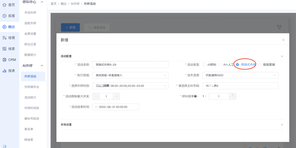 从解锁列表、线索、客户添加号码到预测式外呼,在选择外呼活动时选择预测式外呼类型的活动即可