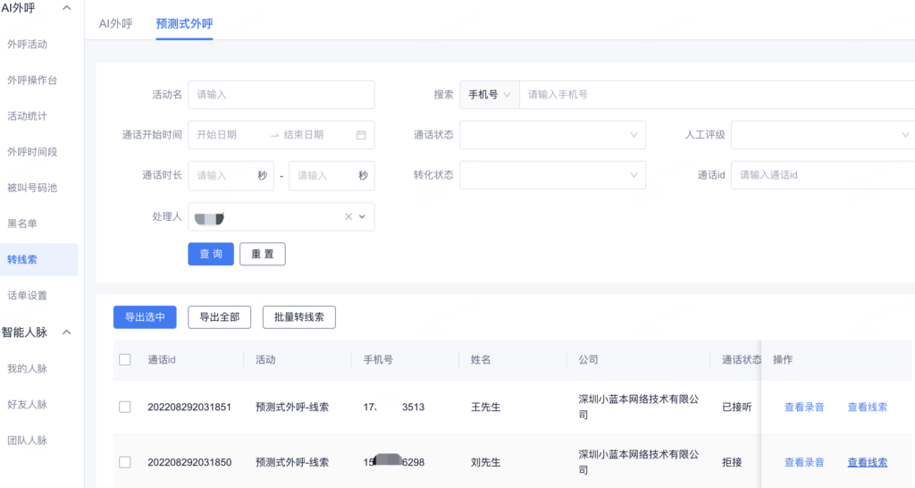 进入转线索-预测式外呼,可以选择话单可进行单个/批量转线索,完成转线索后可查看线索详情