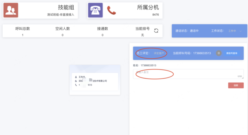 接听电话的用户需要点击【外呼操作台】打开人工坐席,等待电话接入。电话接入后将显示联系人信息,在接听电话的过程中可以进行客户评级、填写跟进记录