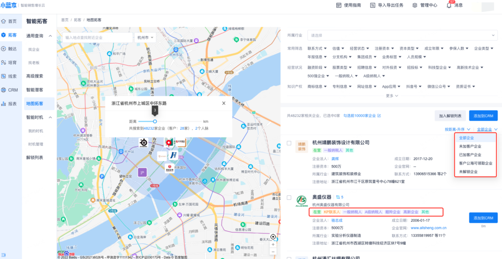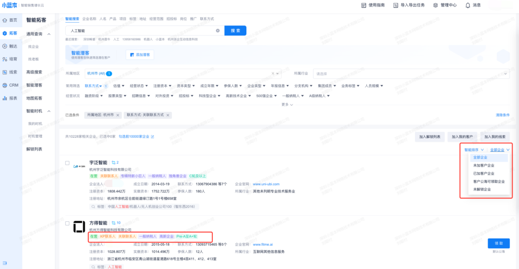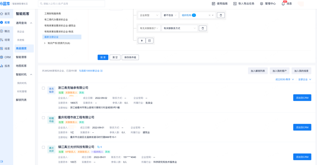 (3)企业过滤:未加客户企业、已加客户企业、客户公海可领取企业、未解锁企业。
