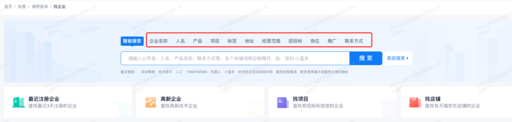 找企业,增加按企业名称、人名、产品、标签等类别搜索。以及最近搜索关键词展示。