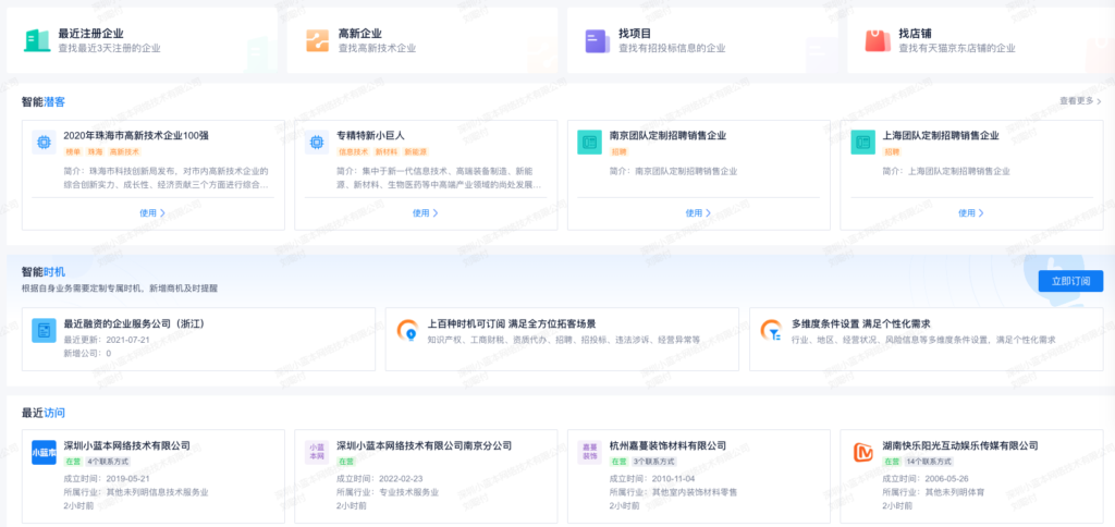 找企业首页,增加智能潜客、智能时机等快捷入口。以及最近访问企业展示。
