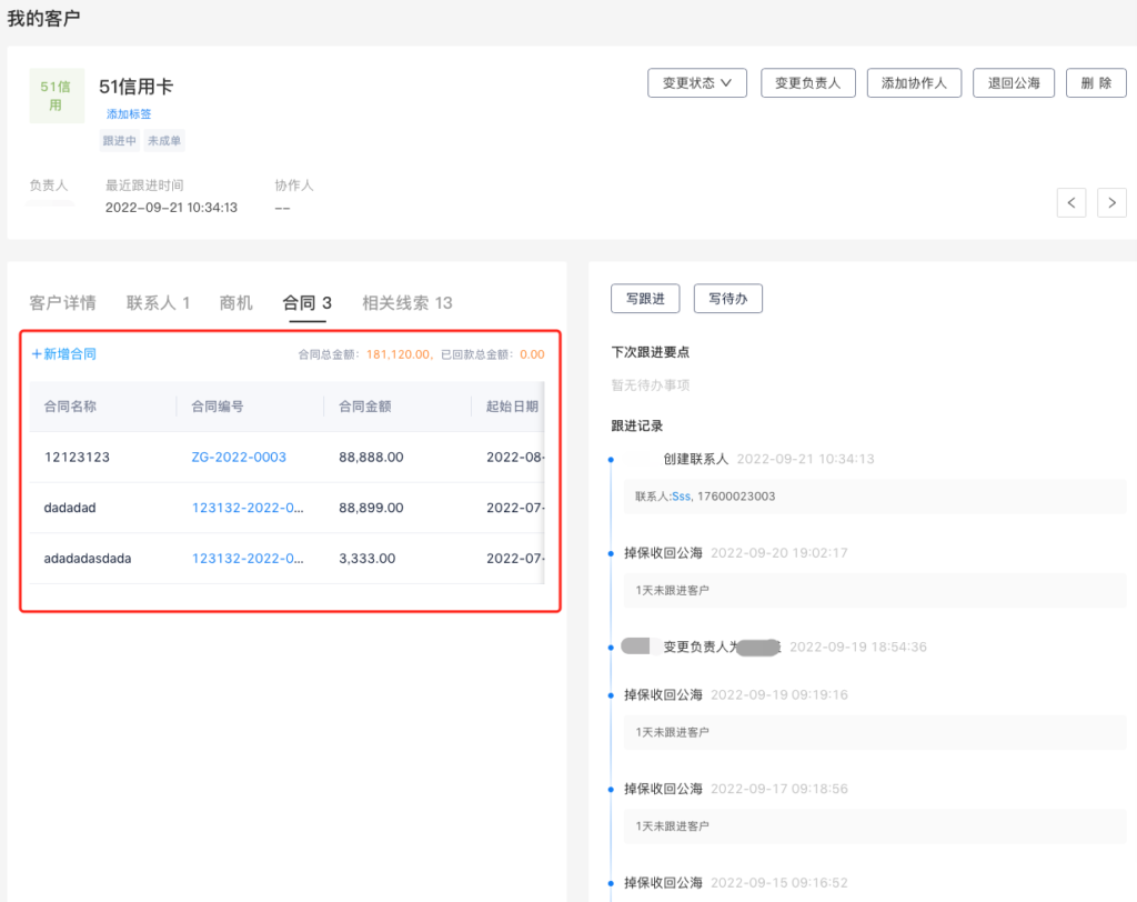 客户详情页,新增「合同」tab,可新增合同、查看该客户下所有合同信息。