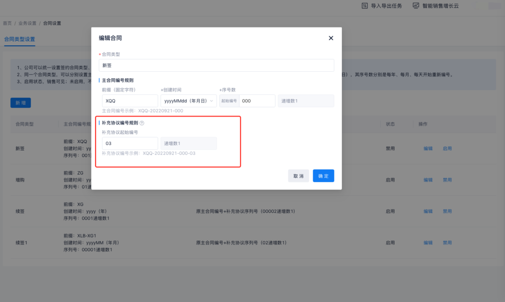 同一个合同类型,可以设置主合同编号规则、补充协议编号规则。