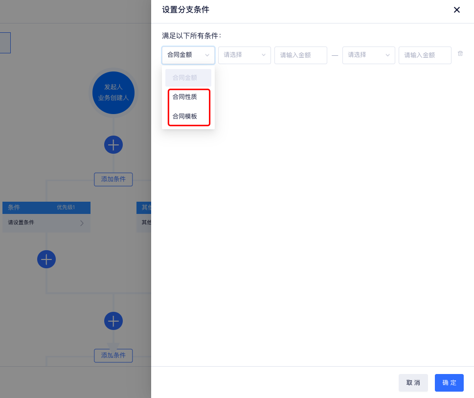 合同审批流程,分支条件新增:合同性质、合同模板;