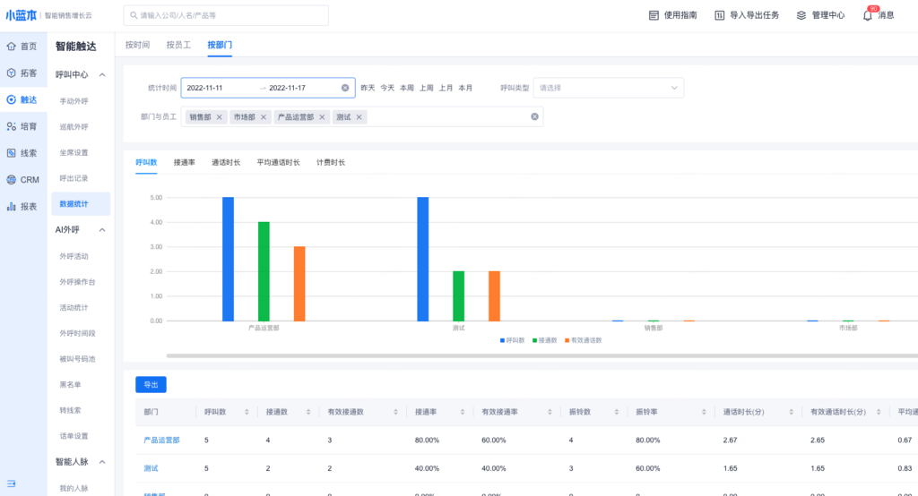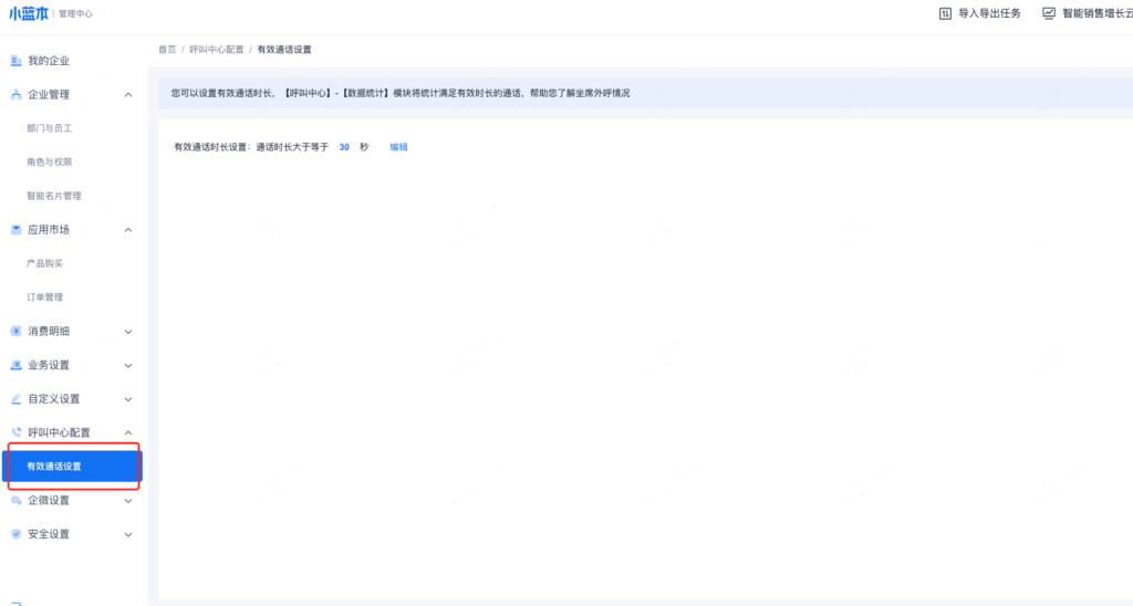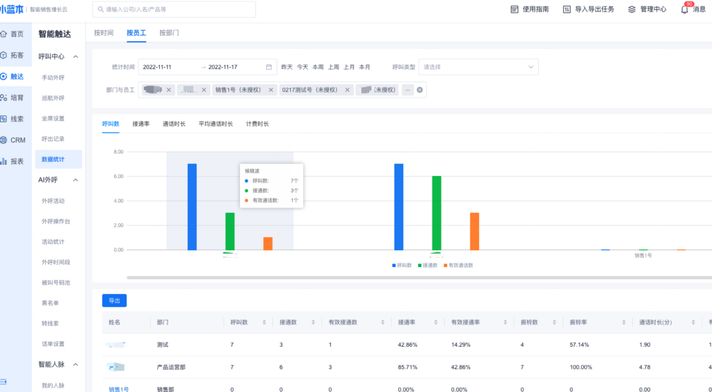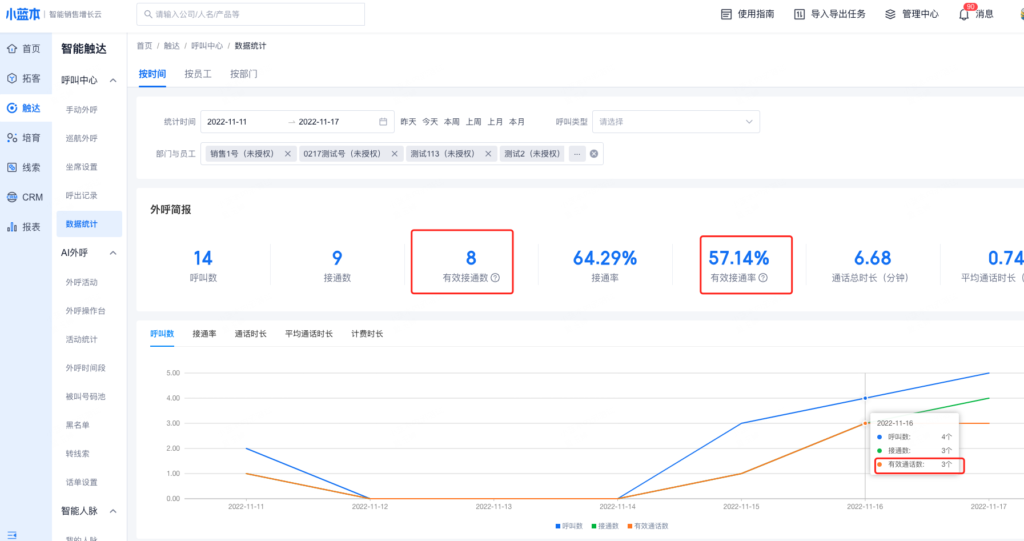 11月17日更新 有效通话时间统计 内容 隐藏 1 有效通话时间设置 2 按员工、按部门统计数据 有效通话时间设置 管理员可设置有效通话时间,【呼叫中心】-【数据统计】模块将统计满足有效时长的通话 按员工、按部门统计数据 可按照员工、部门查看呼叫中心的数据统计报表