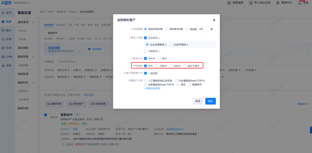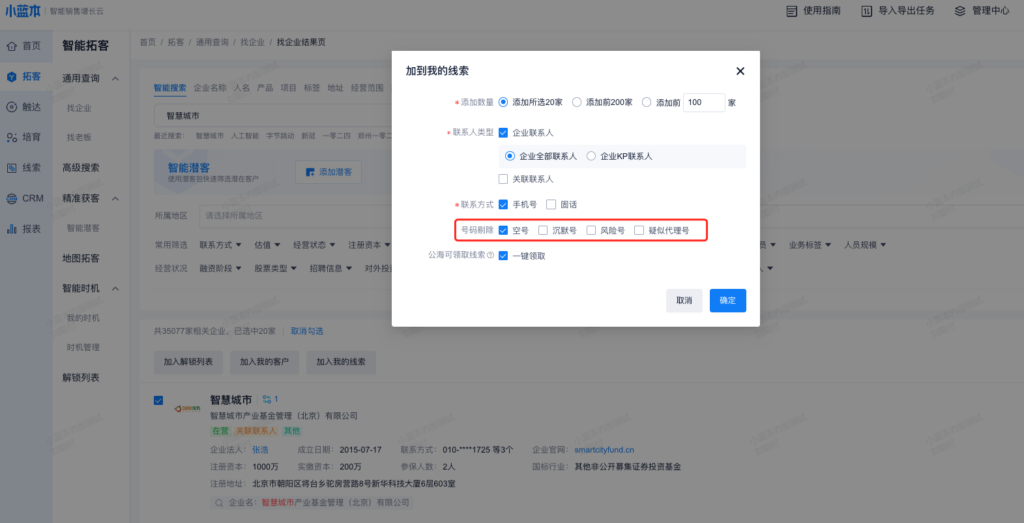 找企业、高级搜索、地图拓客、时机消息列表、企业主页等,批量/单个添加线索时,号码过滤可单独剔除:空号、沉默号、风险号、疑似代理号。