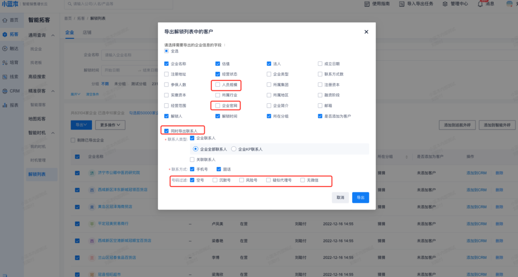 - 解锁列表导出,企业信息字段,新增:人员规模、企业官网;