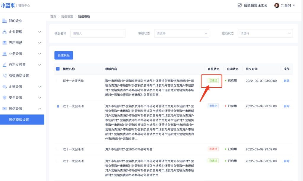 短信模板审核通过之后,就可以选择模板发送短信。审核通过的模板可以删除,审核中的模板不支持删除
