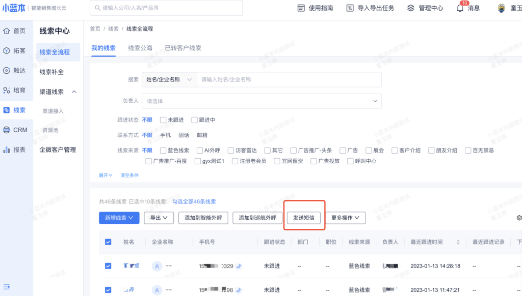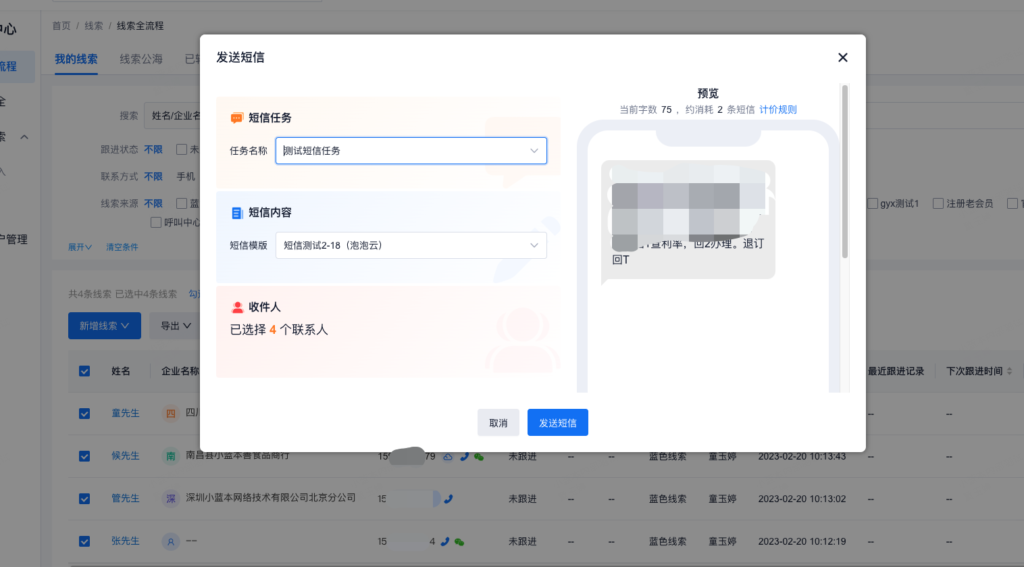 线索、CRM均支持短信群发,增加触达客户的机会。在线索列表、CRM列表中勾选需要发送短信的联系人,点击【发送短信】进入短信内容编辑页