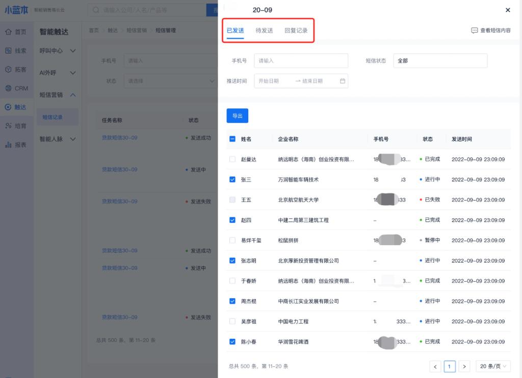 点击任务名称进入短信任务发送详情,可以查看已发送、待发送短信记录以及短信回复记录