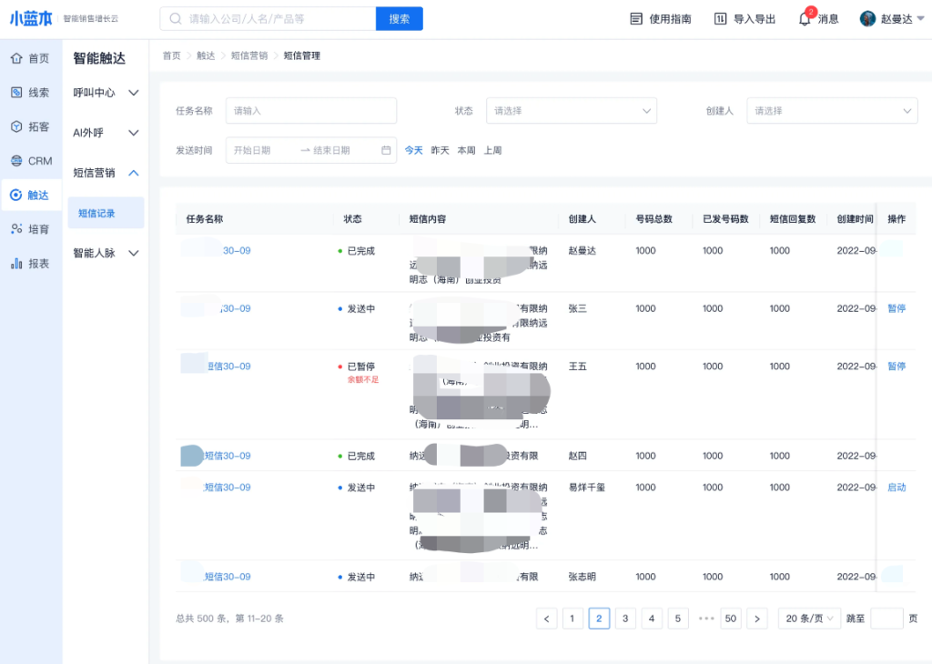 进入【触达】-【短信记录】可查看短信任务的发送状态和发送详情。发送中的短信任务可支持暂停