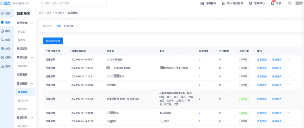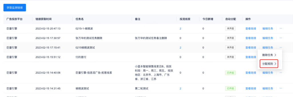 每个监测任务识别的线索都可以设置自动分配规则,设置之后,可自动分配给相关的销售人员;未设置,识别的线索,需要手动分配。
