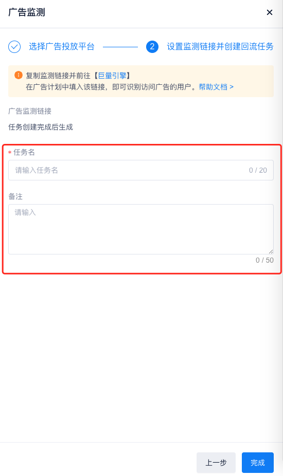 (2)填写任务名、备注。点击【完成】即创建任务,并生成监测链接。