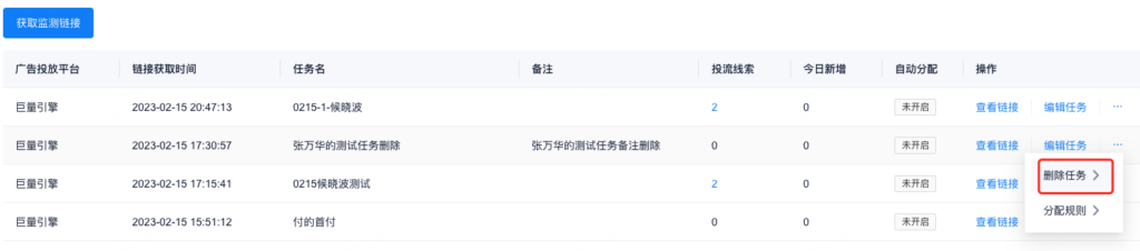 投流线索=0的任务,可以删除。删除后,不再推送识别的访客。投流线索>0的任务,不能删除。