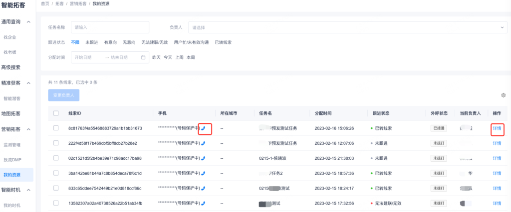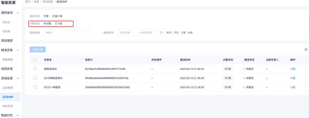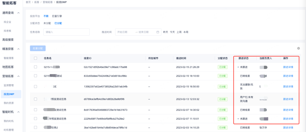 投流DMP列表,是识别的访客线索。可以分配给相关销售人员进行跟进。