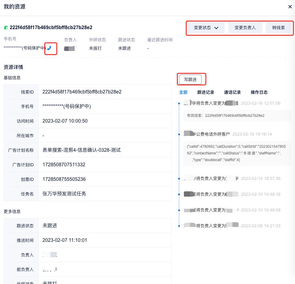 资源详情页,可拨打联系客户,可写跟进记录、变更状态、变更负责人,即转线索。