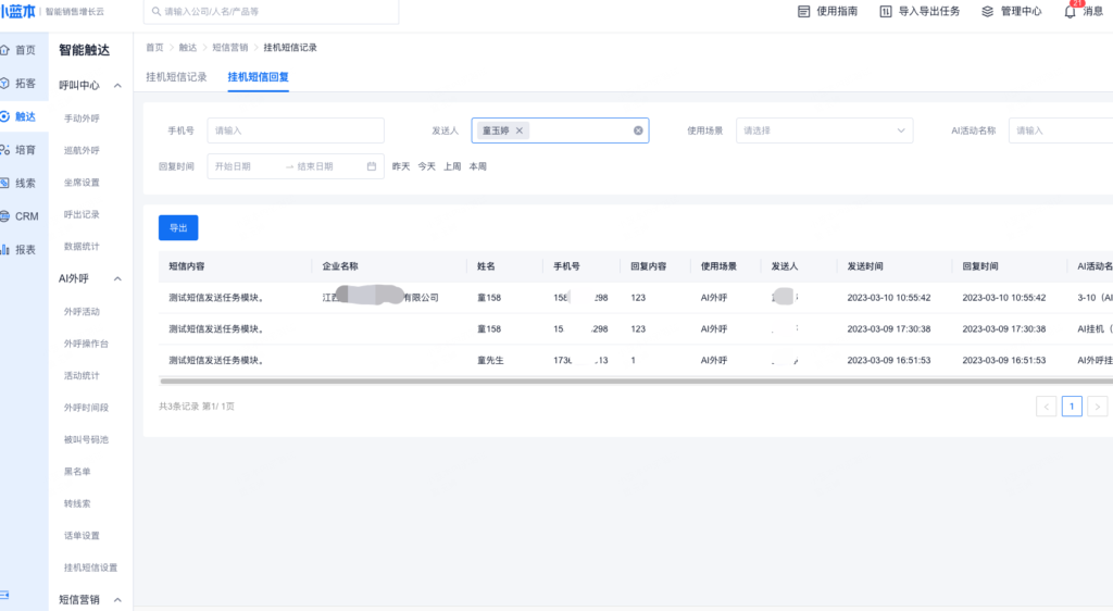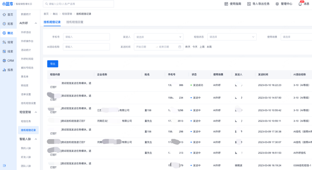 进入【短信营销】-【挂机短信记录】可查看短信的发送结果以及短信回复数据