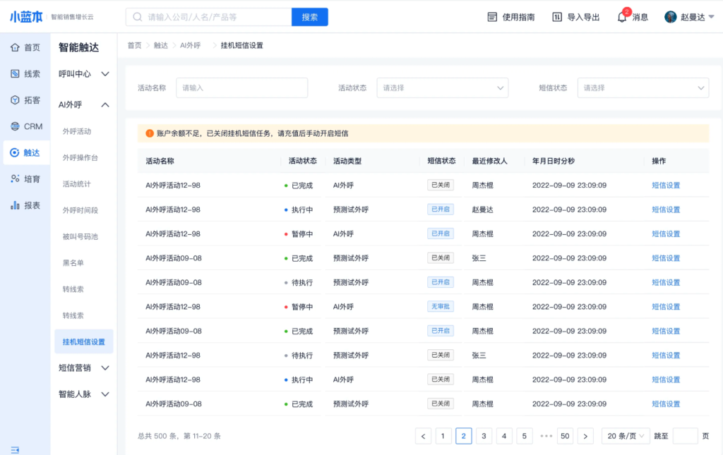 创建AI外呼活动后,进入【挂机短信设置】模块设置挂机短信规则。点击【短信设置】进入挂机短信设置页面,如果AI活动正在执行中,则需要暂停活动后在设置挂机短信