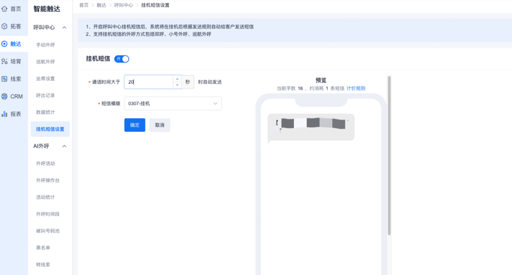 进入【呼叫中心】-【挂机短信设置】设置挂机短信规则,开启呼叫中心挂机短信后,系统将在挂机后根据发送规则自动给客户发送短信。支持挂机短信的外呼方式包括双呼、小号外呼、巡航外呼。现支持根据通话时间设置发送规则。
