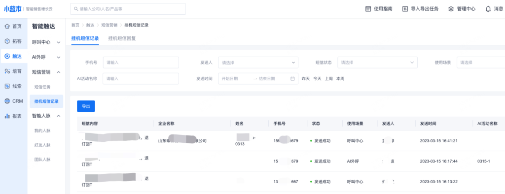 进入【短信营销】-【挂机短信记录】可查看挂机短信发送记录。使用场景选择 呼叫中心,可查看来源于呼叫中心的挂机短信记录、短信回复记录