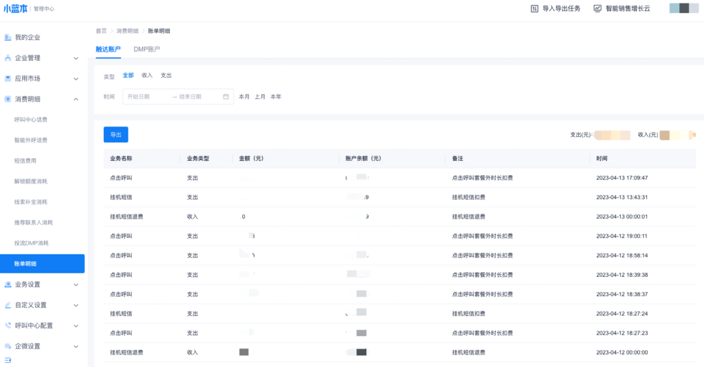 可分别查看触达账户和DMP账户的充值、消费明细。
