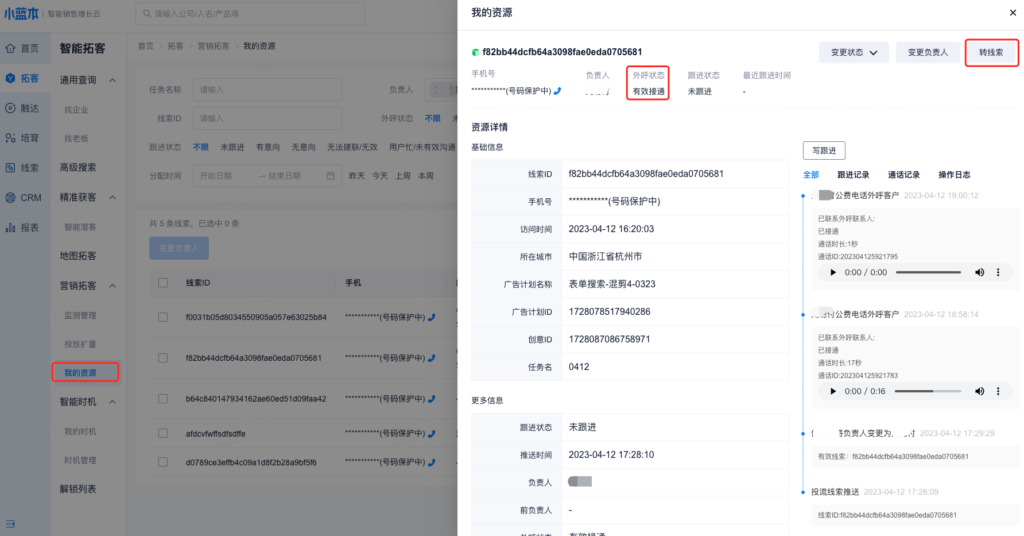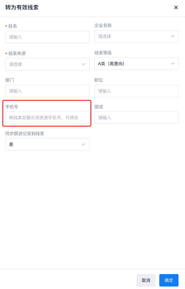 转线索时,手机号码可不填写,转线索成功之后,会自动显示。也可以填写客户提供的手机号,转线索之后,线索详情会展示填写的手机号。