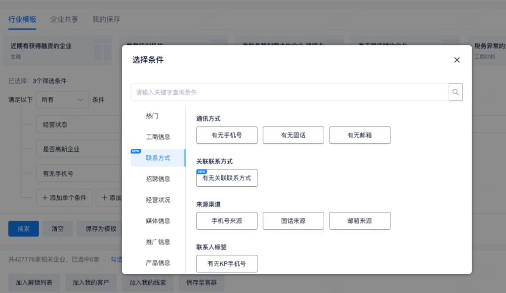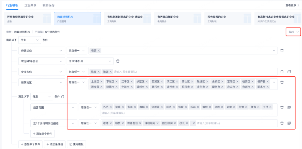 2023.04.20更新:高级搜索优化 内容 隐藏 1 更新内容 2 筛选条件分类 2.1 筛选条件展示优化 更新内容 高级搜索筛选条件分类筛选条件设置:展示所有条件项筛选条件分类 每个模块的筛选条件按业务属性等分类,便于查找; 有新增的筛选条件时,会有提醒,显示:new角标。 筛选条件展示优化 每个筛选条件下展示所有选项; 点击「收起」,可以收起筛选条件,便于查看筛选结果。