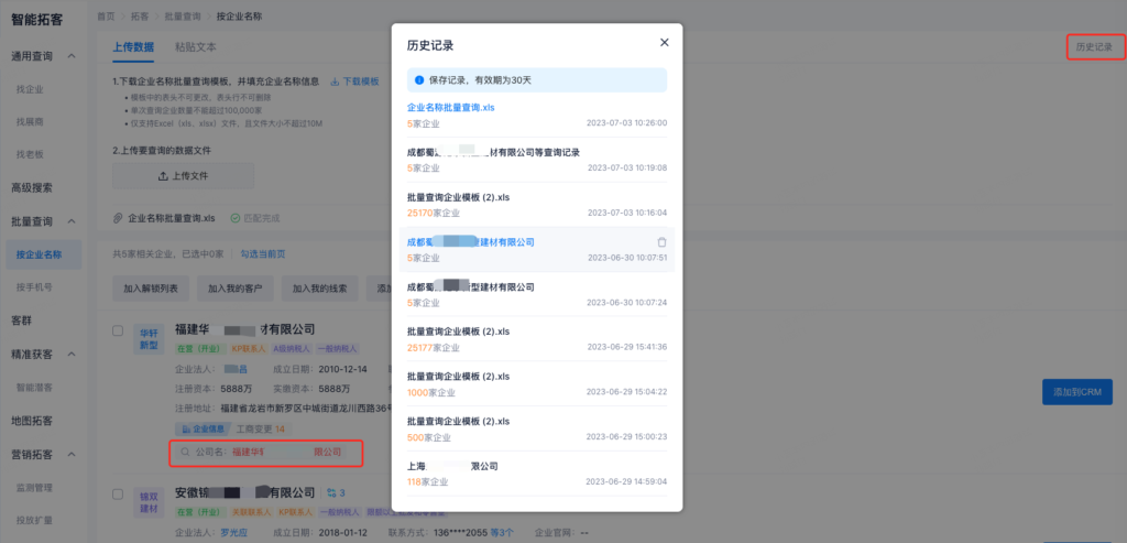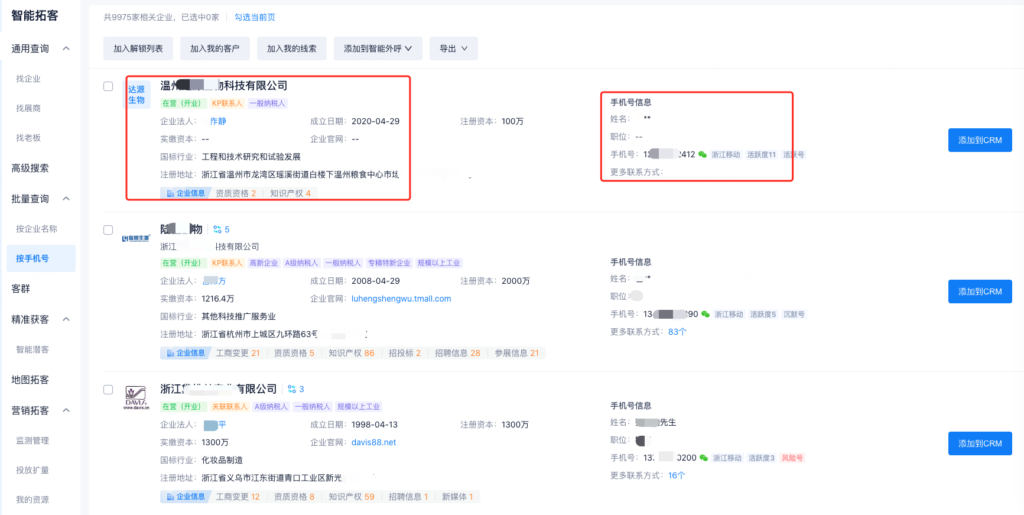 查询匹配的企业,可以批量添加到解锁列表、添加客户、添加线索、添加到智能外呼或批量导出。
