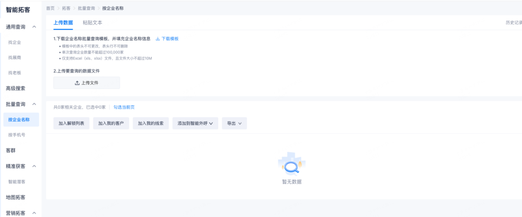企业名批量查询,单次查询上限上调至10万左右,文件大小不能超过10M。