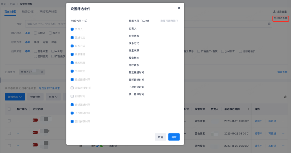 线索(我的线索、已转客户线索、公海线索)、客户(我的客户、协作客户、公海客户),可自定义筛选条件。
