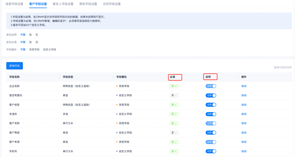 线索、客户、联系人,系统字段支持设置是否启用、是否必填