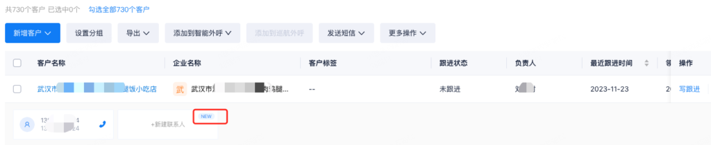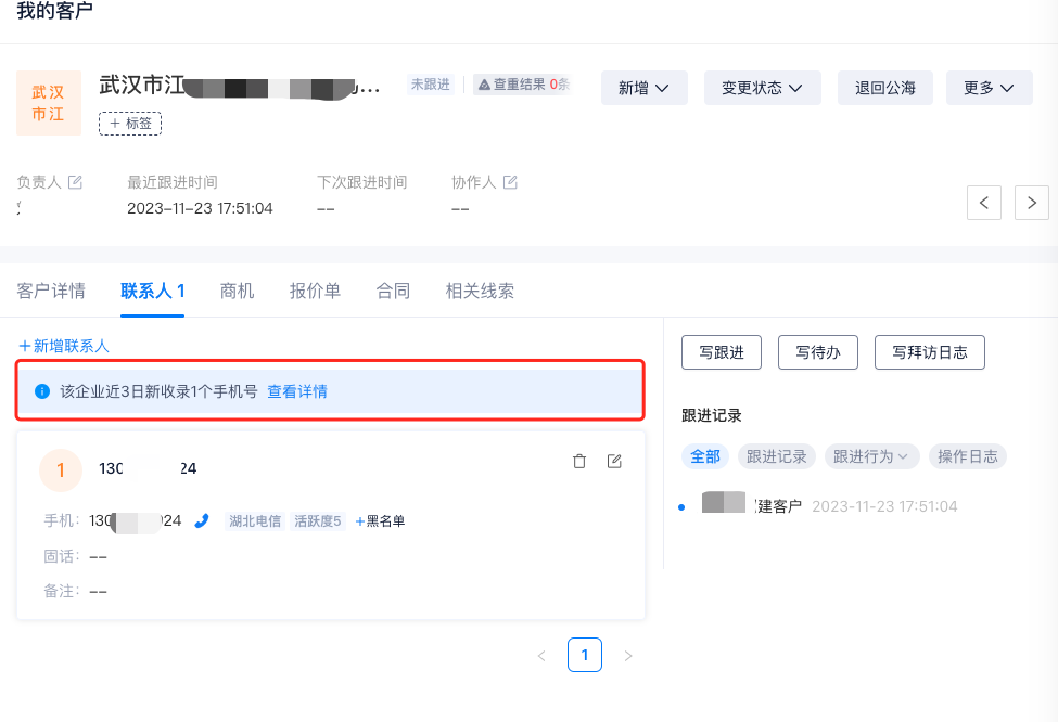跟进中的客户,如果最近3天有新增联系方式,在客户列表和客户详情页会有提示。