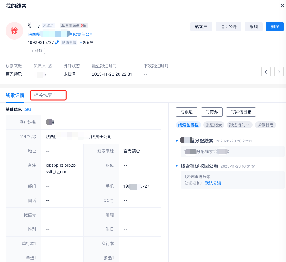 增加了:相关线索模块,展示本人名下、公海相同企业名称的线索。
