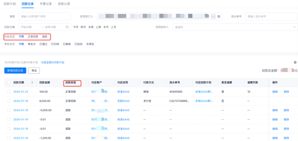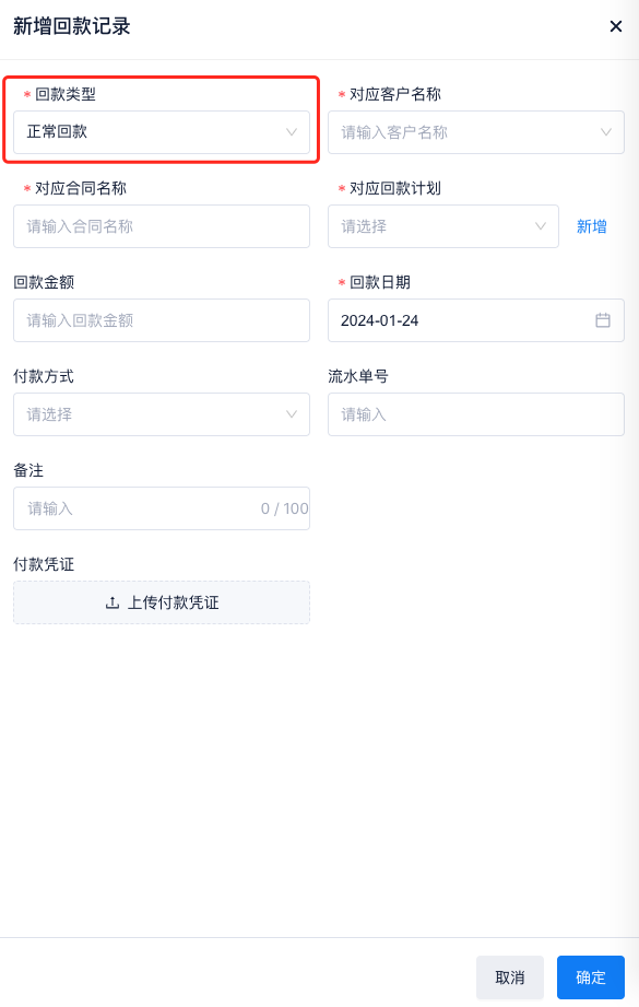 新增/编辑回款记录,可以选择:回款类型,默认:正常回款。