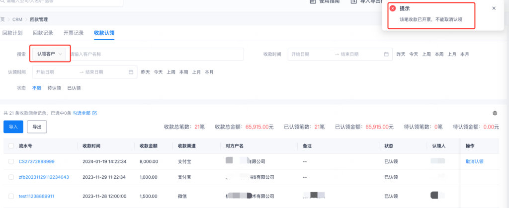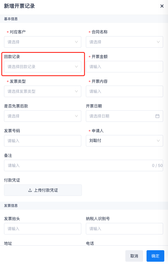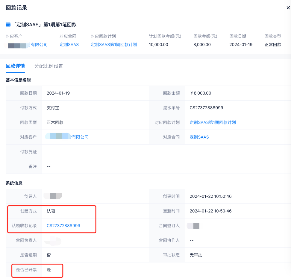 是否已开票:该回款记录已关联开票信息,则提示:已开票。