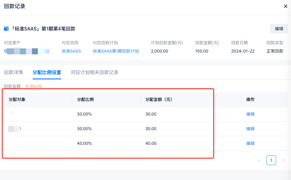 分配比例设置,可设置该笔回款对应合同的签订人、协作人分配比例和金额。