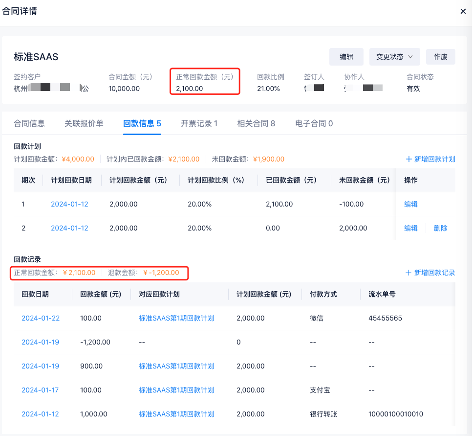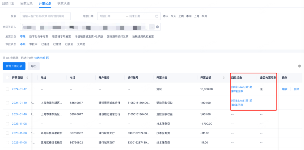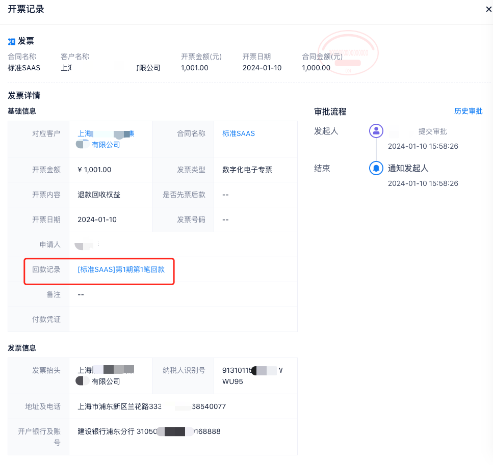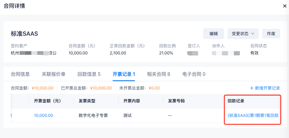 回款记录:该发票有关联回款记录,会显示关联的回款记录;