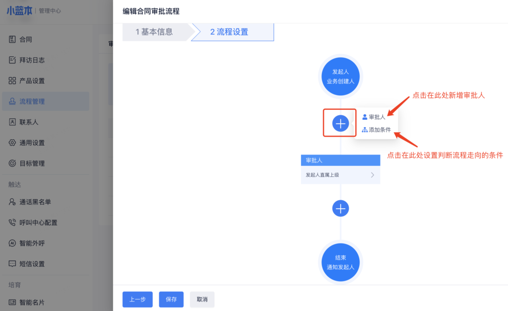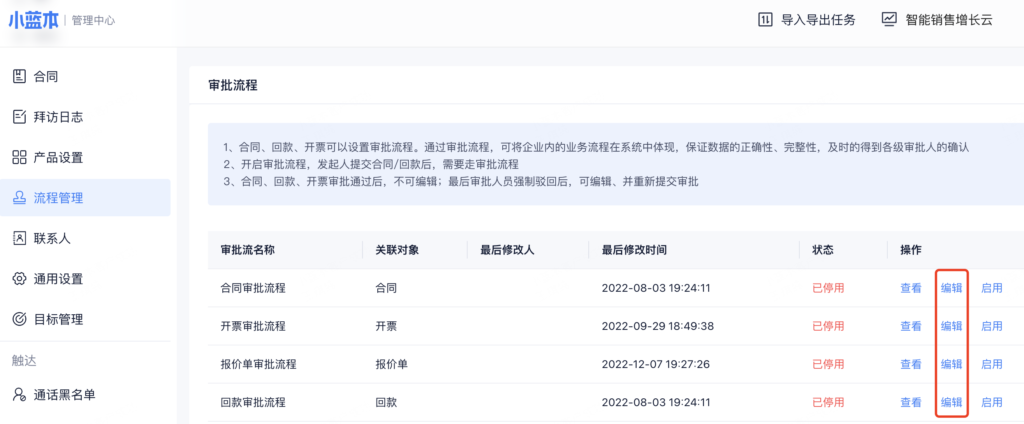 进入【管理中心】-【流程管理】,点击“合同审批流程”/“开票审批流程”的编辑按钮,进入审批流程配置环节。