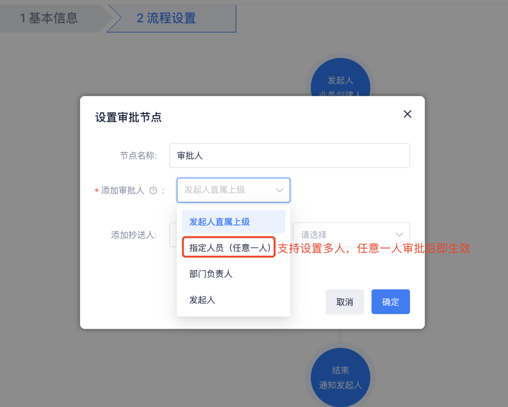 设置审批人时,支持设置为:流程发起人的直属上级(直属上级在【部门与员工】配置)、指定人员(如设置多人,任意一人审批即可通过)、发起人所属的部门负责人(部门负责人在【部门与员工】配置)、发起人本人(可用于如“合同回收”环节的确认)。