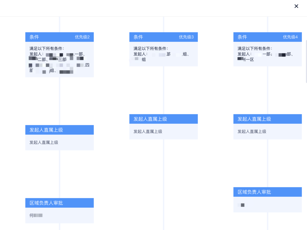 设置流转判断条件时,支持设置多个条件,如按“发起人”、“合同金额区间”、“开票金额区间”等判断流转给不同的审批人。