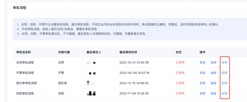 全流程配置完毕后,点击保存,并点击启用,在之后发起的合同/开票将按照本次更新的审批流程进行流转。